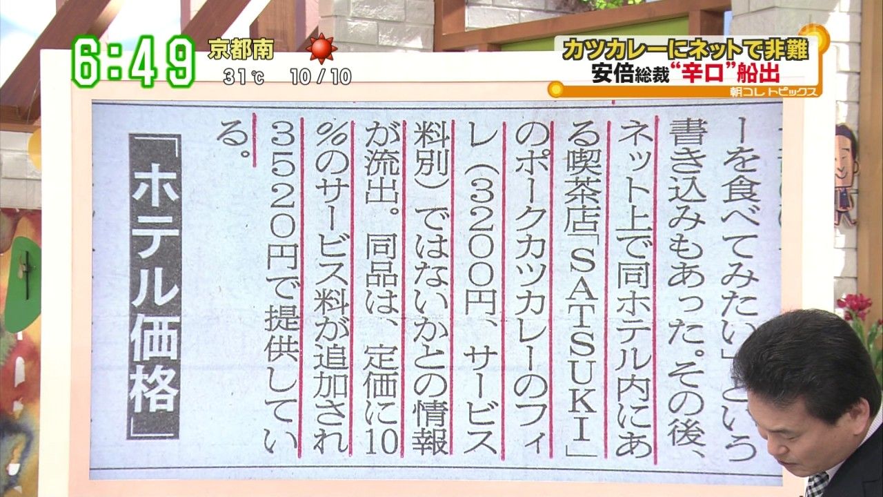 そのカツカレーはホテルニューオータニの『SATSUKI』というレストランで提供されているもので、テレビ番組でその値段を当てるクイズをし、値段を当てられなかったスタジオゲストに対してリポーターが「皆さん庶民ですねー」と発言したことから、ネットでは「『庶民感覚がない』と批判している」と話題に。「庶民だって、ここぞという大事なイベントではご馳走食べる」「3500円のカツカレー食べて、庶民感覚が無い!とか叩かれたくないよね」「国背負ってる人たちがレトルト食ってたら国民であるこっちが恥ずかしいわ」などのコメントが寄せられた。