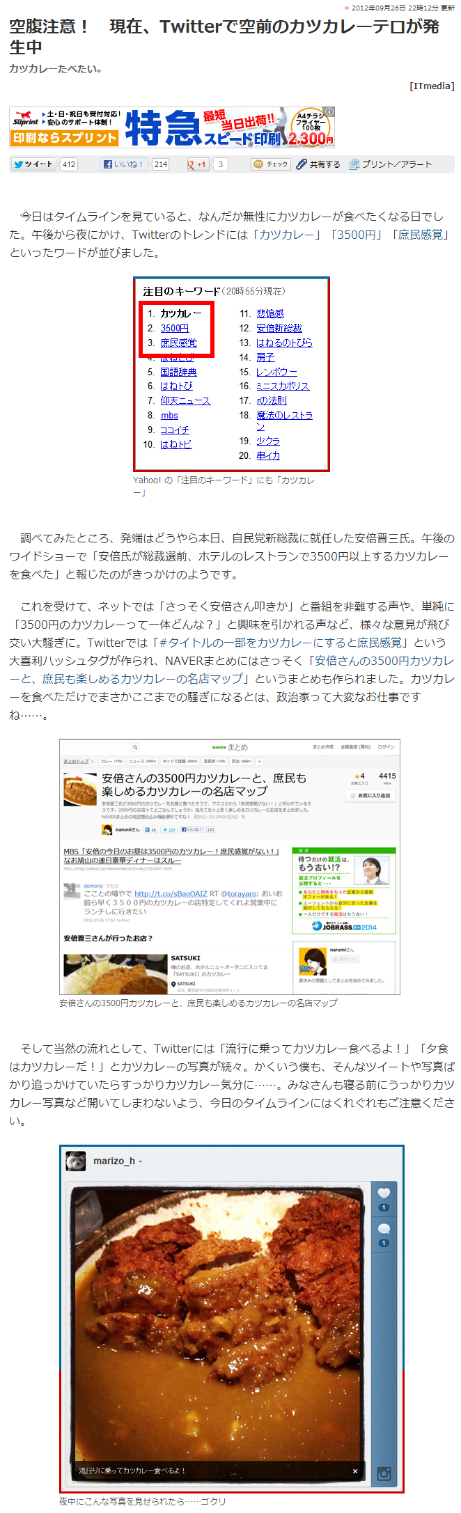 自民党の安倍晋三新総裁(58)が総裁選直前に3500円以上するカツカレーを食べていたことが報道され、ネットのでは「『庶民感覚がない』と批判している」との声が上がっているが、一方では「カツカレー食べたくなった」などの声も多数寄せられており、その経済効果に期待が高まっている。引用