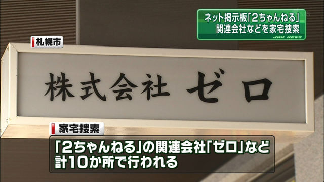 警視庁は、掲示板の管理の実態を解明するため、関係先として「2ちゃんねる」の開設者で元管理人の男性の東京都内の自宅のほか、札幌市や東京・渋谷の関係する会社の事務所などおよそ10か所を捜索していたことが分かりました。(抜粋)