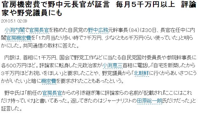 官房機密費の使い道のひとつとして、政治評論をしている人たちに対し「盆暮れ500万円ずつ届ける」などの行為があったと明かした。2010年4月下旬、TBS系番組や沖縄県での講演などで証言した。受け取りを拒否した評論家として、田原総一朗さんの名前だけを挙げている。