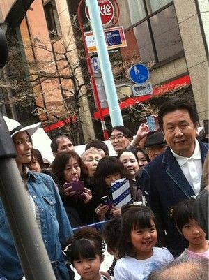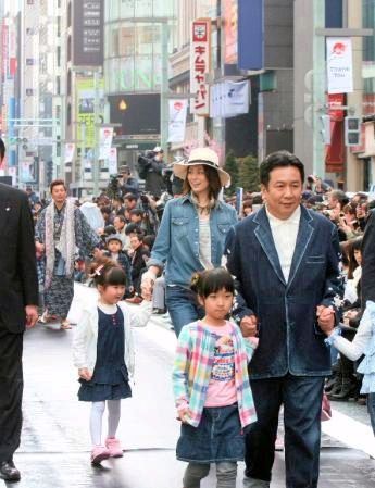 東京・銀座で開催された屋外ファッションショーに出演する枝野幸男経産相(左から2人目)と女優の米倉涼子さん(右から2人目)ら=24日午後